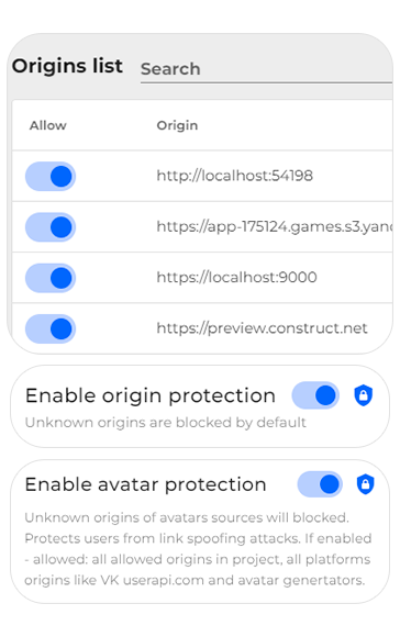 You can use all the features of our backend directly from the game. No need to have your own server. We process payments from platforms and authorize players. Everything is ready to use on the client side.